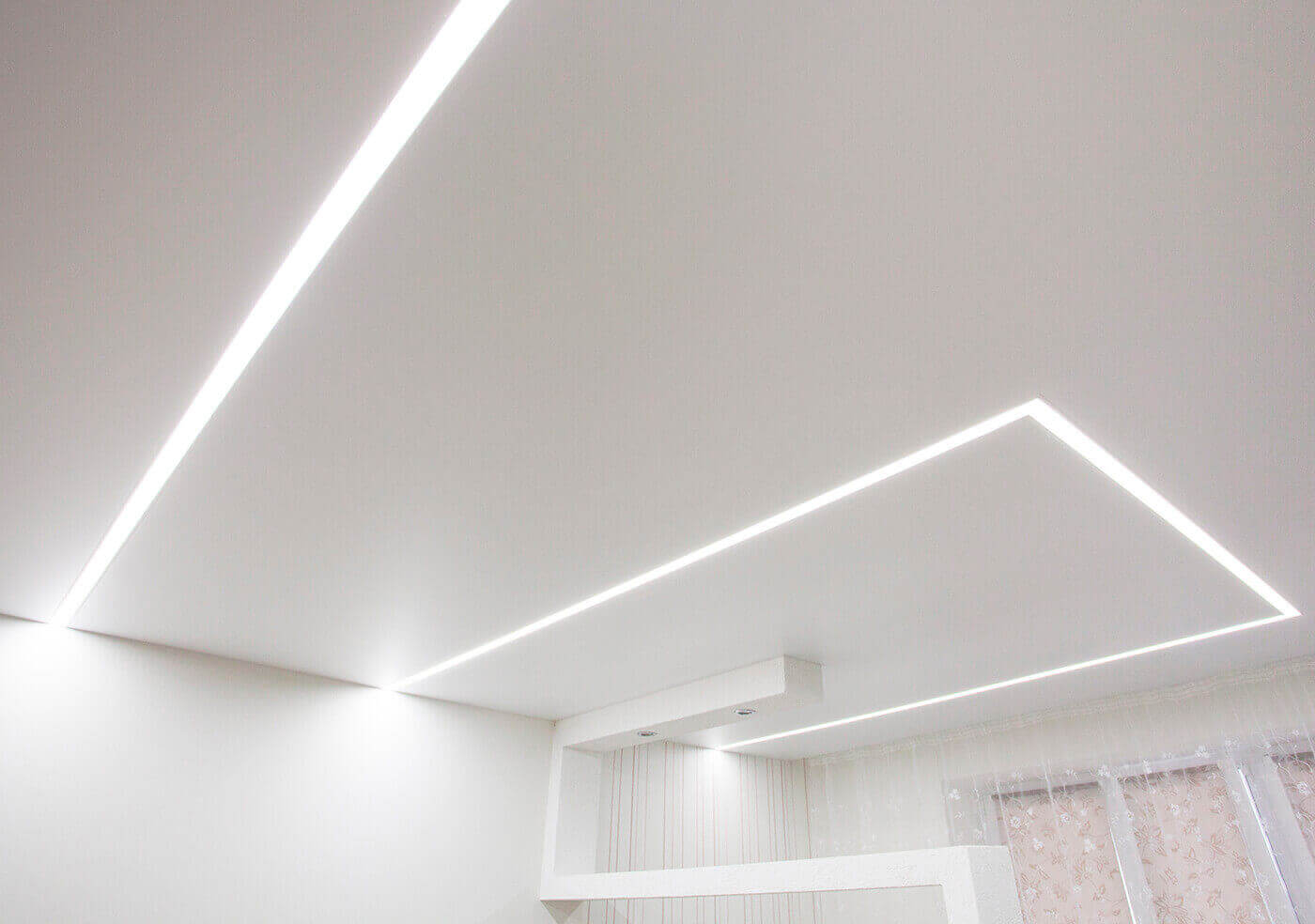 Одним из дизайнерских приемов оформления натяжных потолков являются парящие линии. Это светодиодные ленты под полупрозрачным материалом. Они могут быть прямыми, зигзагообразными, или идти под углом. Располагаться замкнутым прямоугольным или овальным контуром, пересекаться, быть в виде нескольких параллельных, или расположенных под углом отрезков. Форма в данном случае не влияет на их функциональное назначение: Быть основным или дополнительным освещением. Быть элементом зонирования помещения.